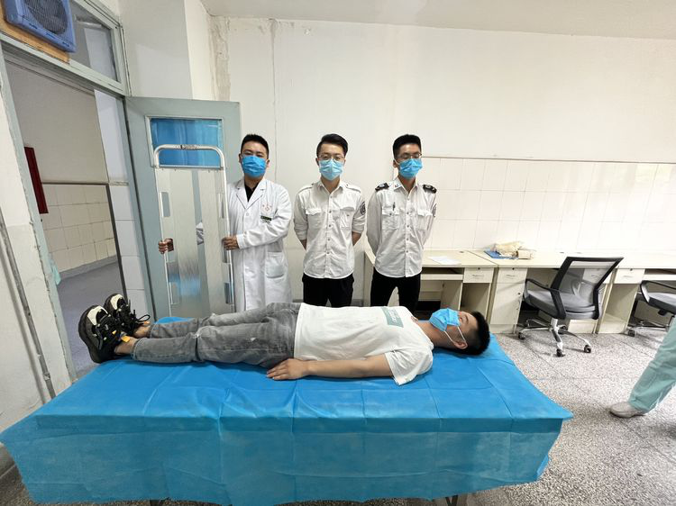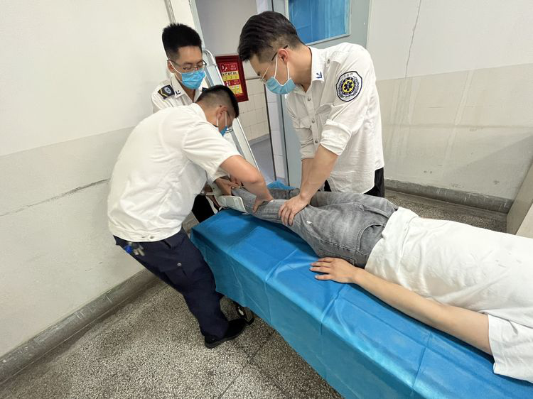 本次演练以心肺复苏、电除颤、气管插管、呼吸机、静脉穿刺及多发伤患者的院前评估、查体、固定及转运为重点内容,突出多人团队一体合作演练。