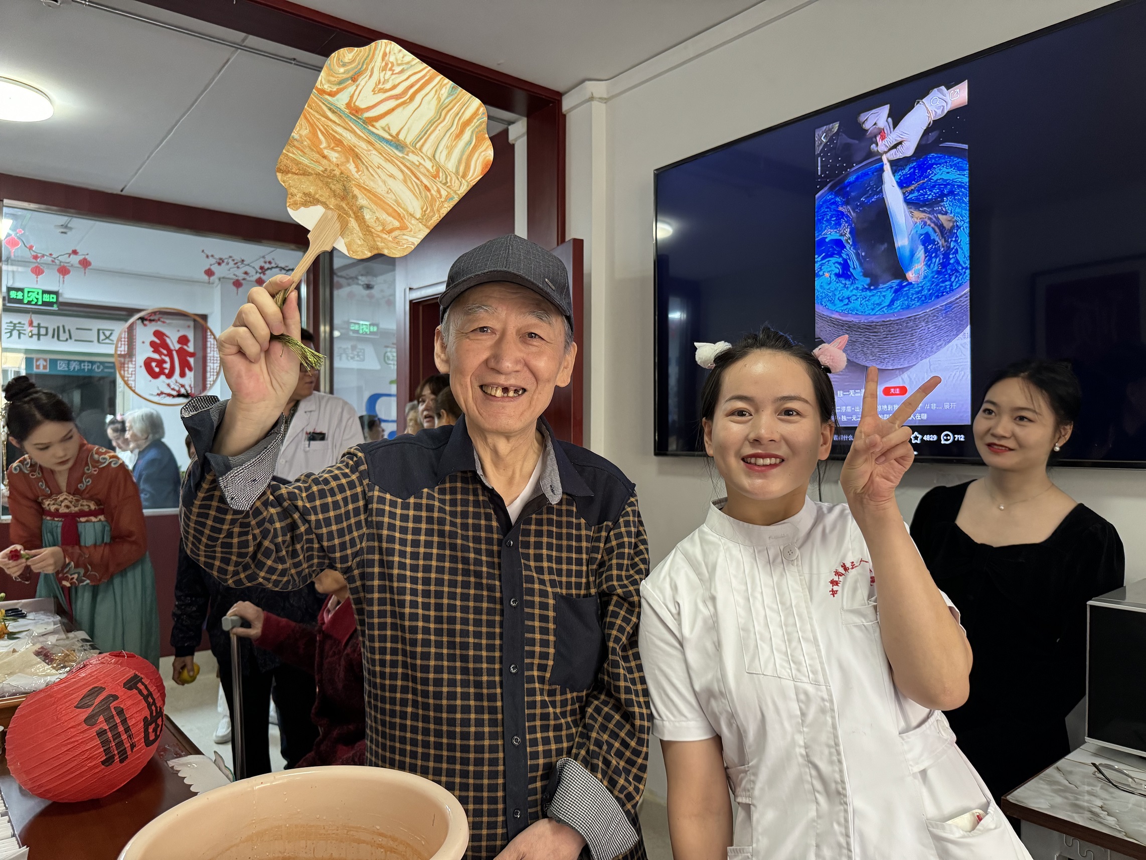 “漆扇摊位”则散发着独特的艺术魅力,老人们在工作人员的指导下开始绘制漆扇。随着老人们的精心绘制,一把把原本空白的漆扇逐渐变成了独一无二的艺术品,每一把漆扇都承载着老人对中秋佳节的美好想象,也展现了传统漆扇艺术在医养中心的传承与创新。